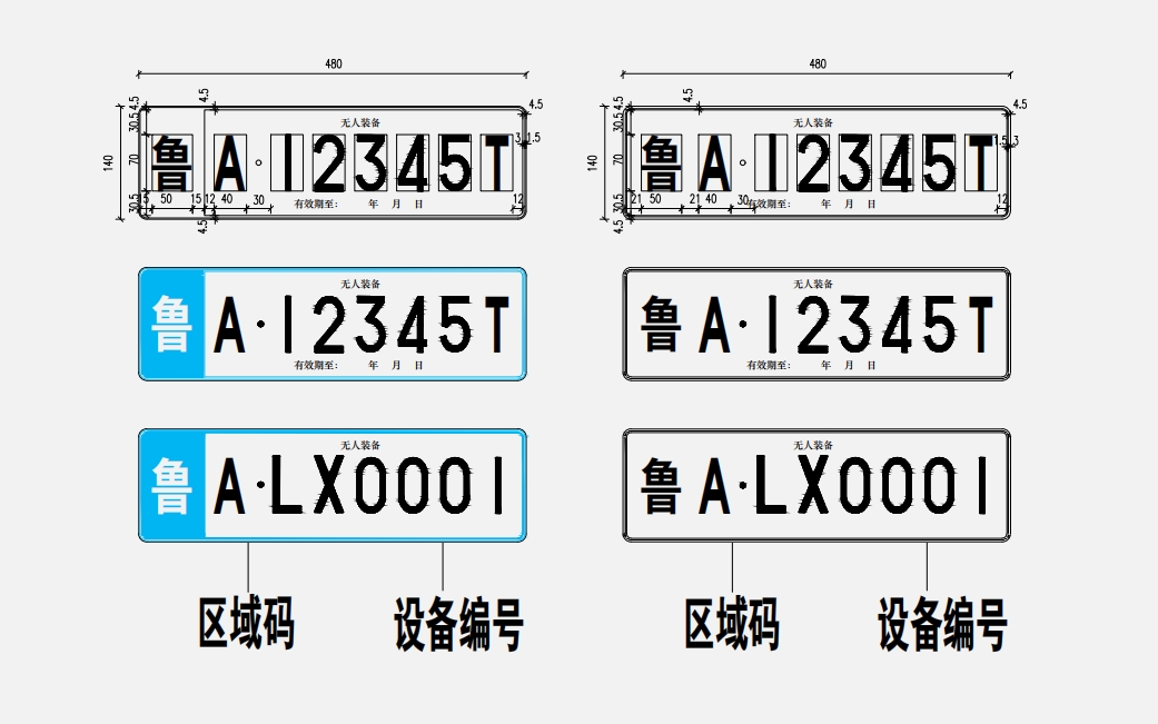 在济南市行政区域内进行示范应用的功能型无人车实行“一车一码”,每辆无人车分配一个终身且唯一的车辆编码。车辆编码前7位由1个代表济南市的大写字母A、两个代表区县(功能区)名称的大写字母和4个阿拉伯数字组成(例:A·LX0001),车上张贴标识为:无人装备。